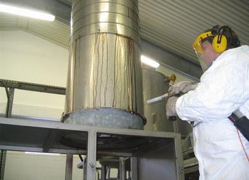 - Grotere apparatuur die semestrieel of jaarlijks een (manuele) opknapbeurt nodig heeft wordt typisch met DROOGIJSSTRALEN gereinigd: bv tanks, ovens, extruders, ...